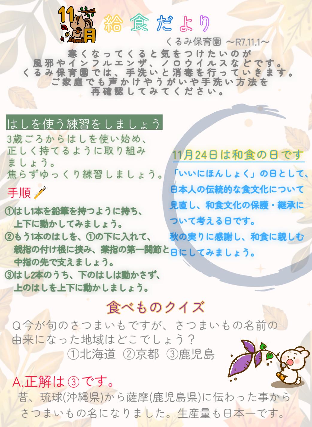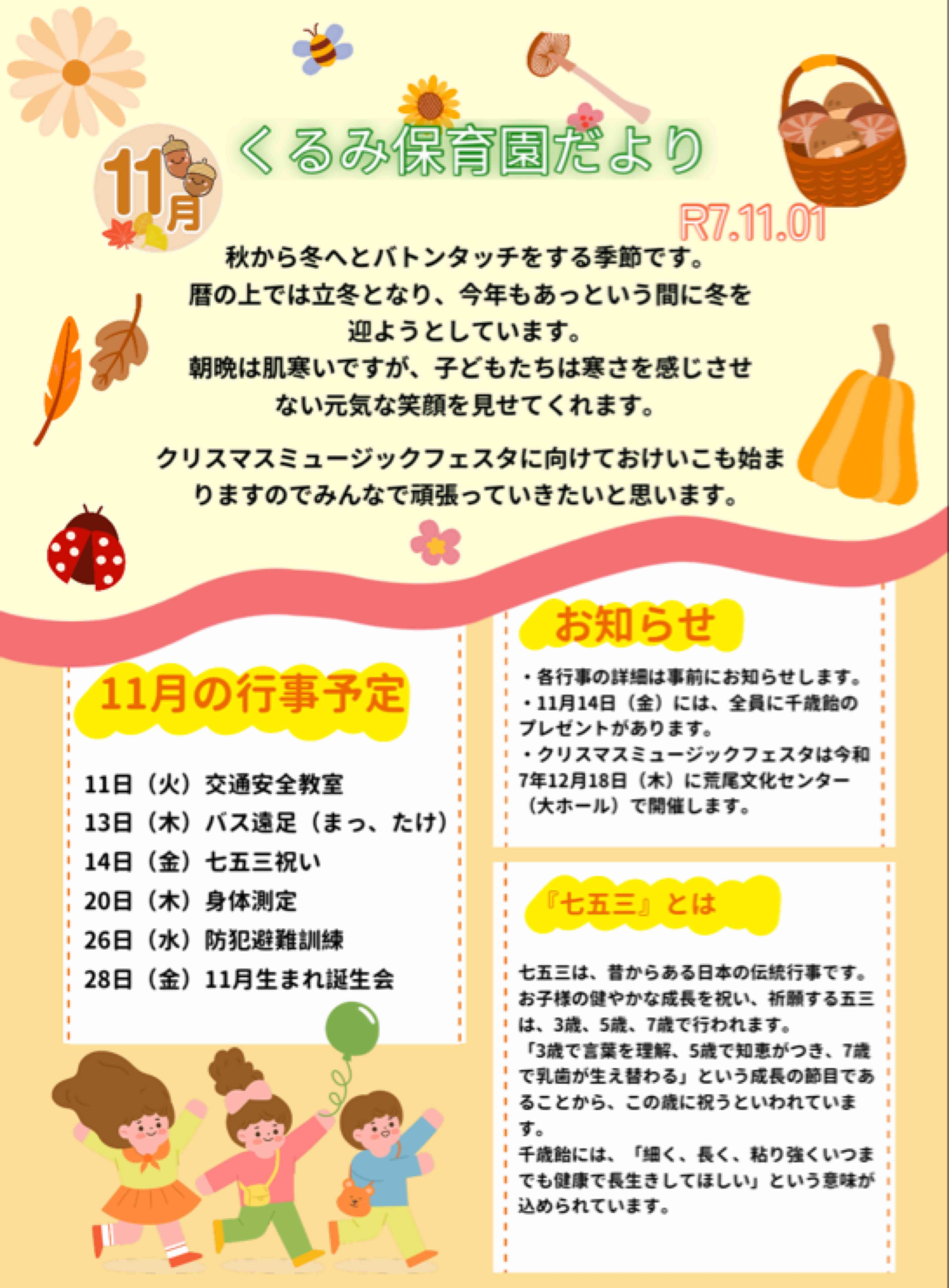 10月31日(火)🎈🐤New🐤🎈 「11月の園だより、給食献立表、給食だより」 を更新しました😊 令和7年度 年間行事予定表をアップしました✨ |